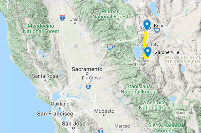 63 miles. 5 days/stages. Moderate difficulty. The route starts in Gardnerville, Nevada and ends in downtown Reno, Nevada (or reverse). Most of the walking will be on hard surfaces (city sidewalks, streets, roads). Some stretches will be on dirt roads and trails. Stages 1 & 5 are flat or gradual decline. Stages 2 & 3 include long gentle climbs. Stage 4 includes a moderately steep climb for 5 miles.