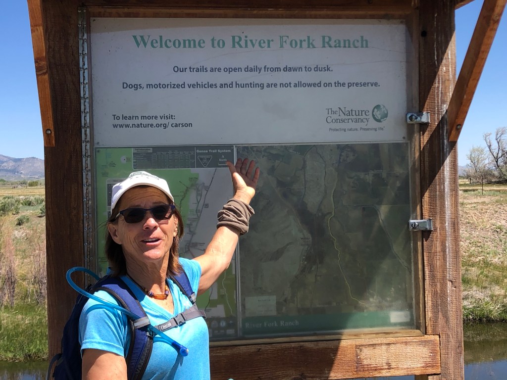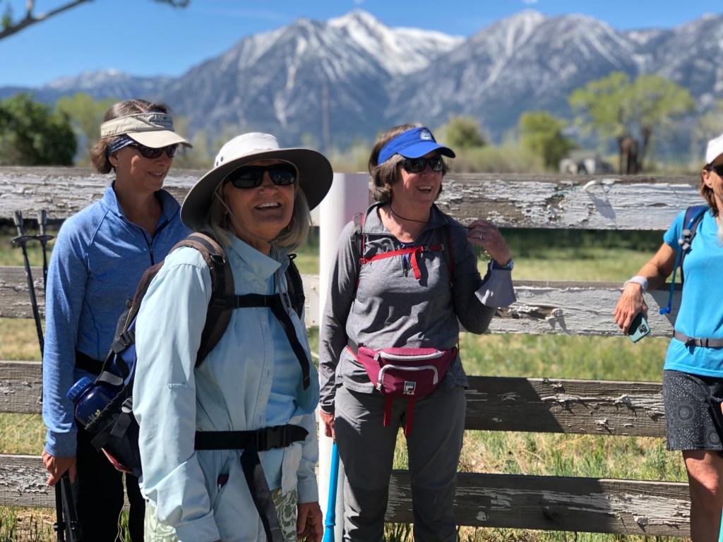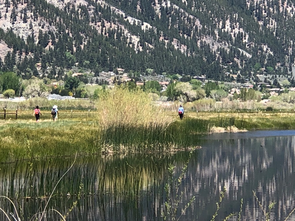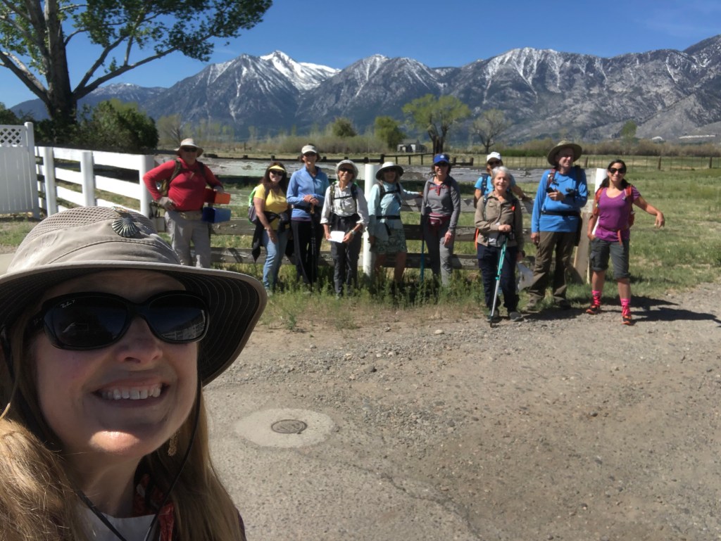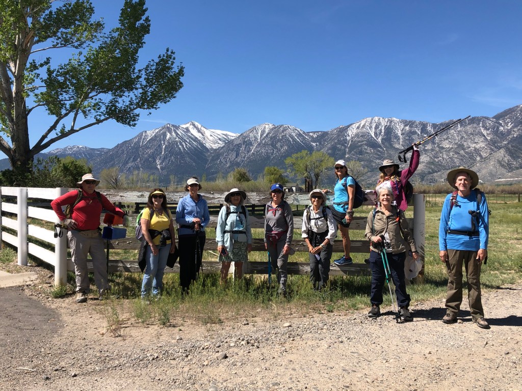 What a delight to meet up with 11 new companions on a 65 mile trek from Minden to Reno, NV on our Pine Cone Camino to Reno adventure. We began the morning’s walk under a beautiful blue sky and an incredible view looking west to the snow-capped mountains that rise over Lake Tahoe. We walked through lovely neighborhoods, alongside cow pastures and down the edge of the East Carson River to the Nature Conservancy’s River Fork Ranch near Genoa, approximately 5 miles from our starting point. While there we lounged while eating lunch and enjoyed a talk about the numerous restoration projects in the immediate flood plain.