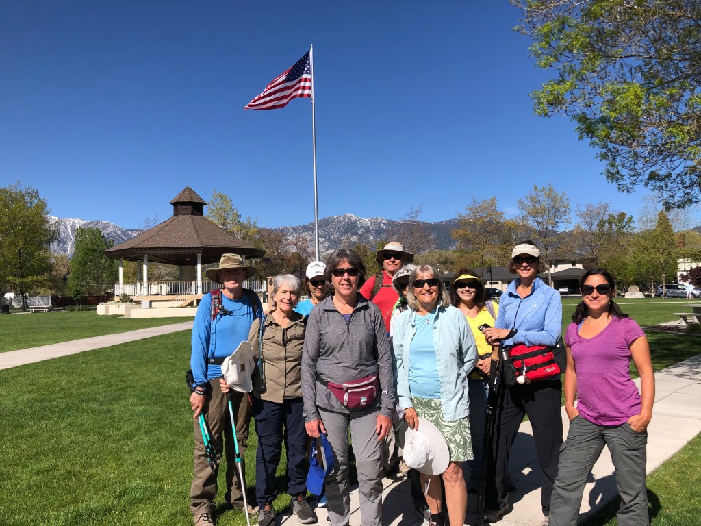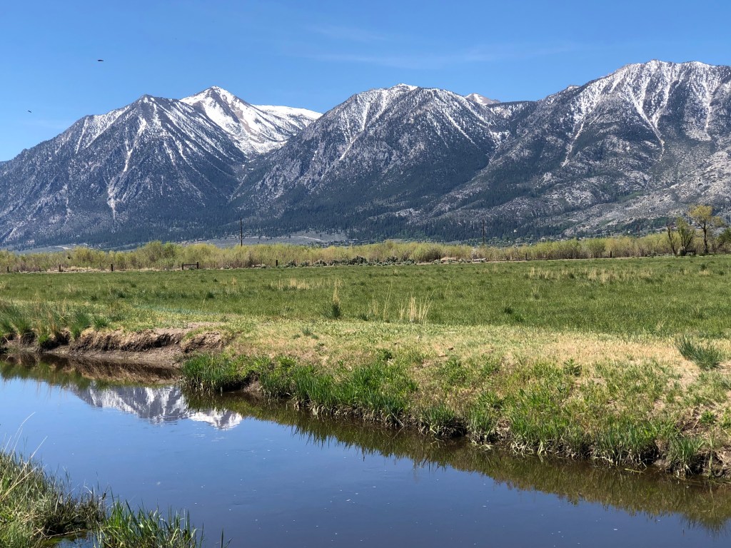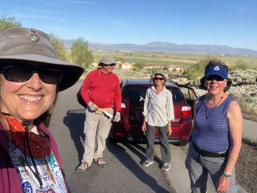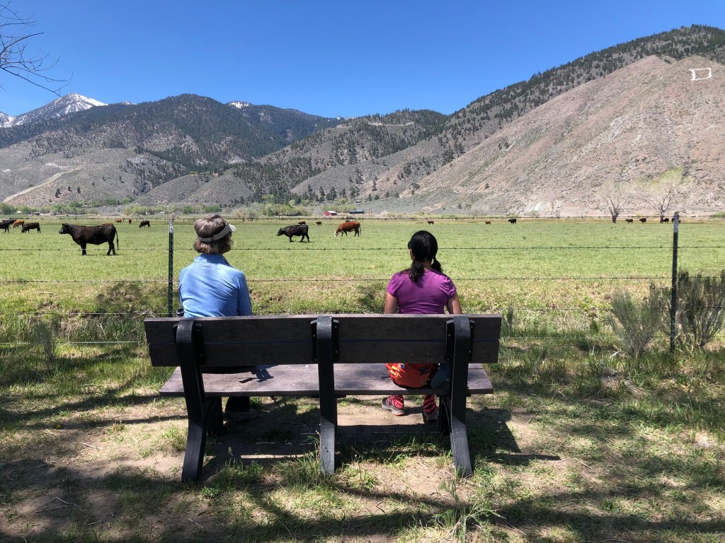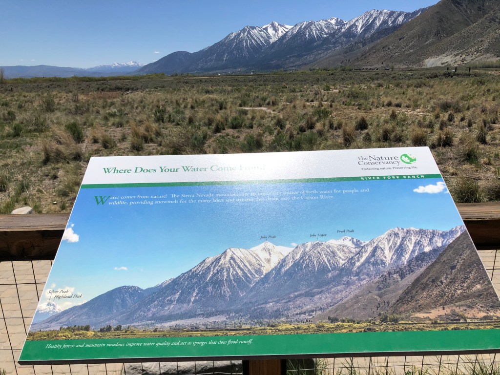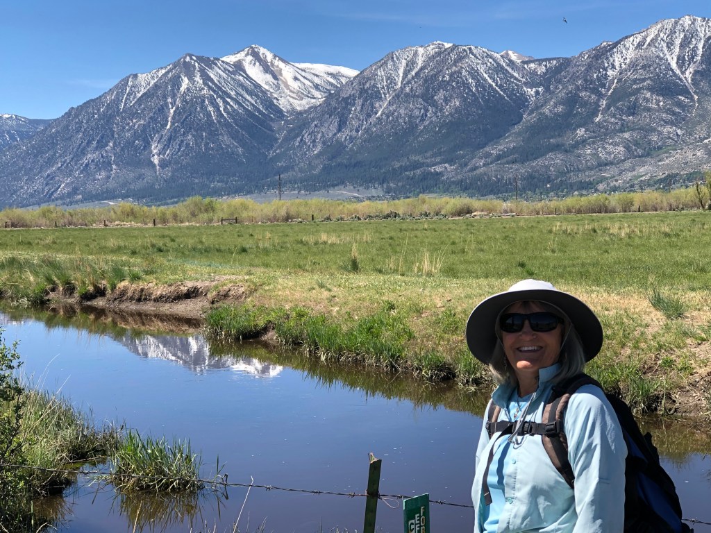 What a delight to meet up with 11 new companions on a 65 mile trek from Minden to Reno, NV on our Pine Cone Camino to Reno adventure. We began the morning’s walk under a beautiful blue sky and an incredible view looking west to the snow-capped mountains that rise over Lake Tahoe. We walked through lovely neighborhoods, alongside cow pastures and down the edge of the East Carson River to the Nature Conservancy’s River Fork Ranch near Genoa, approximately 5 miles from our starting point. While there we lounged while eating lunch and enjoyed a talk about the numerous restoration projects in the immediate flood plain.
