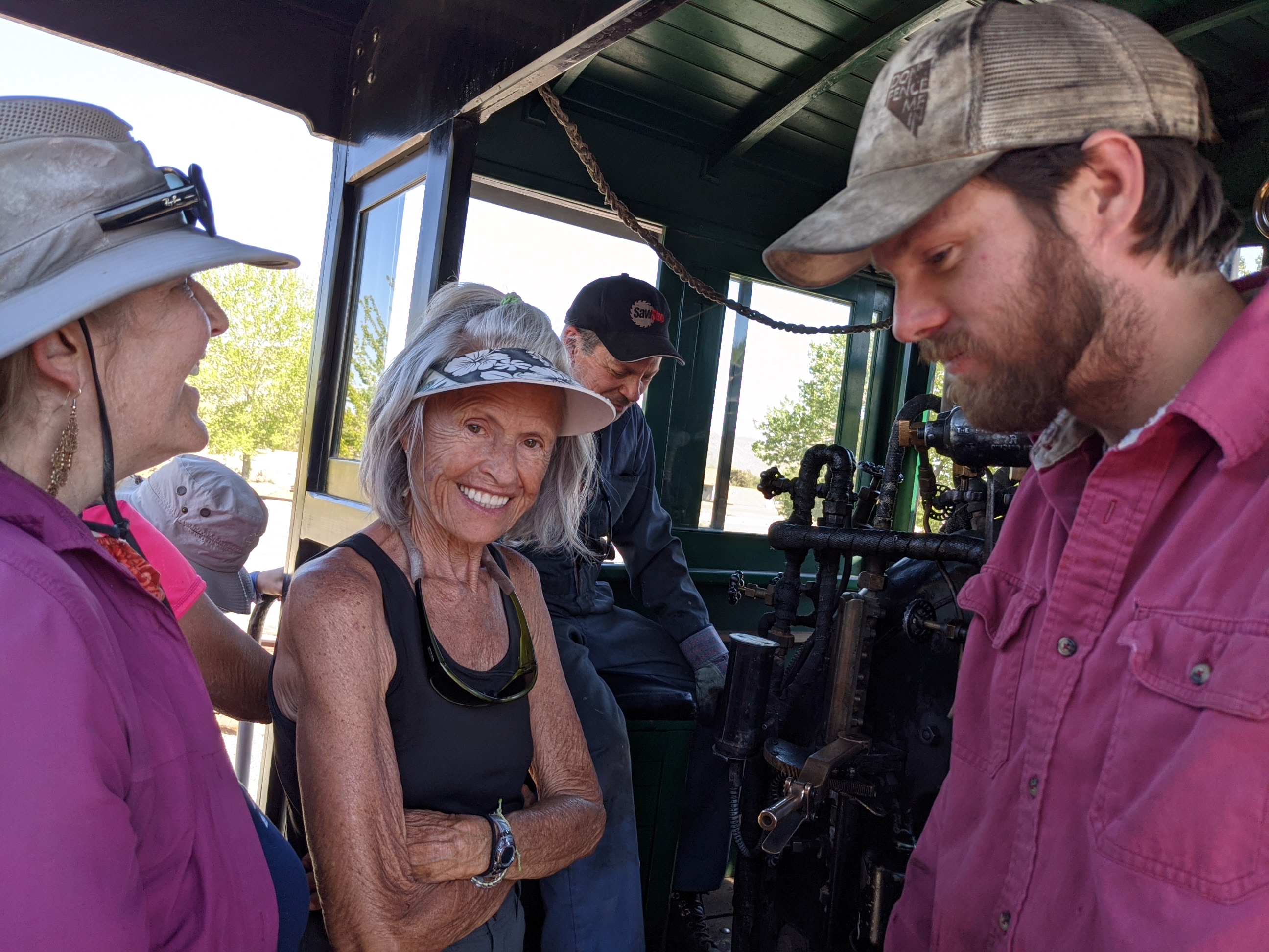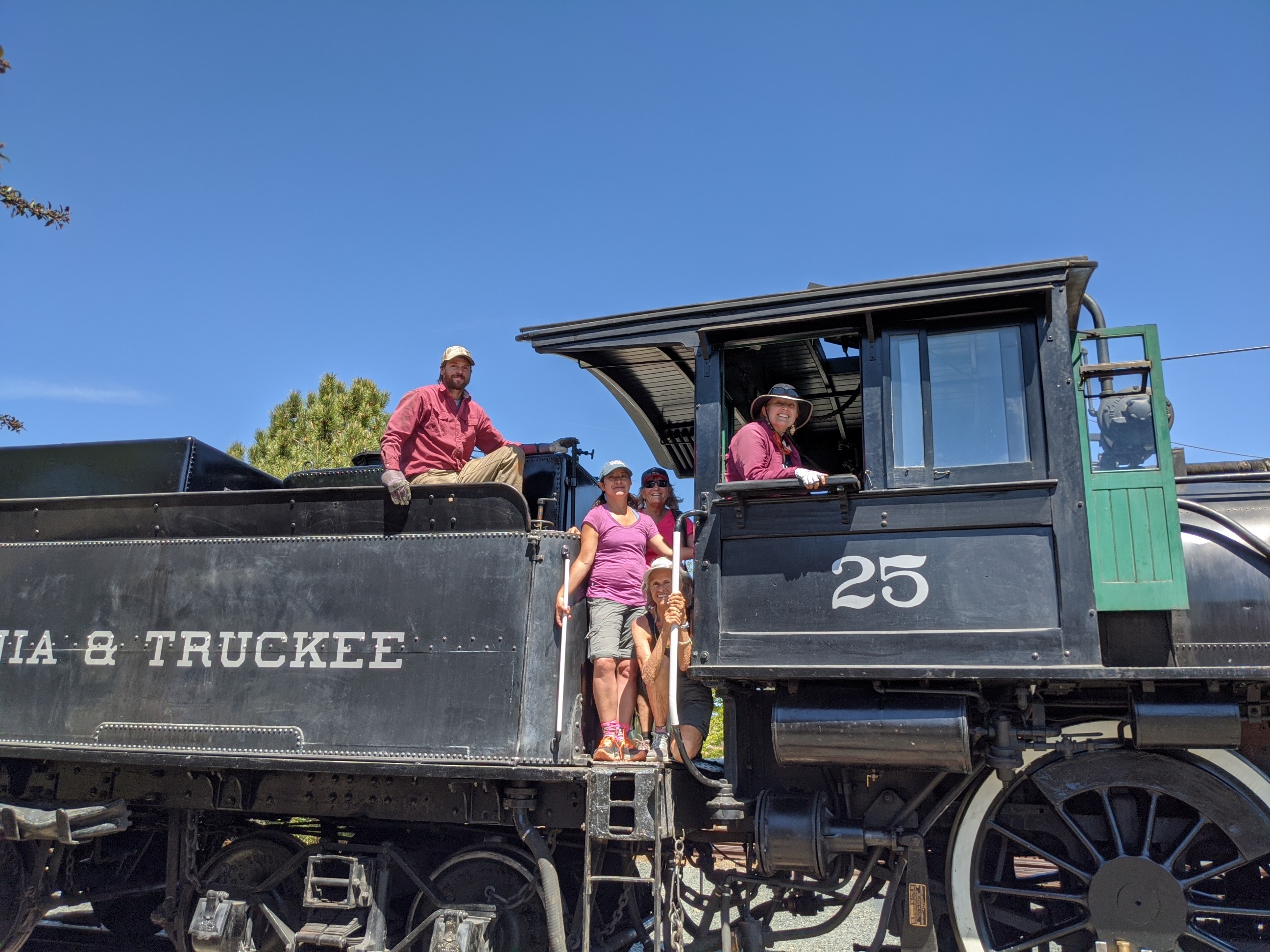 It was a grand day for day two of the Minden Camino to Reno adventure. The group started off with a 5 mile hike from The Town of Genoa to Jacks Valley Elementary School and up the hill to enjoy the hospitality of one of the walkers. A shady patio with cushy lawn chairs, cold lemonade and some fresh banana bread made for a nice respite from the warming sun. The group then proceeded another mile to Fuji Park in Carson City and on to the Nevada State Museum. To the delight of the group, the engineers at the Nevada State Railroad Museum were gearing up for a test run on Steam Engine Number 25 and they invited us aboard for a quick talk on the history and workings of this historic engine. What fun! The route then continued on through some of the tribal lands of the Washoe Tribe of Nevada and we viewed a replica of a Washoe Indian bark house. The group then continued on to the historic silver domed Capitol of Nevada originally built between 1869 and 1871. After reaching the center of Carson City the thirsty travelers were seated and served cold beers at the Fox Brewpub. The group then dispersed – some knocking off a few extra miles heading north and some toured the Capitol Plaza enjoyed the memorials and statues depicting our lost heroes and early explorers. Day three will lead the group on to Davis Creek Park in Washoe Valley.